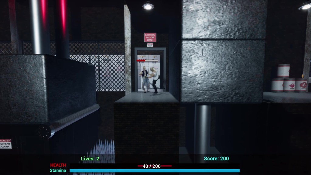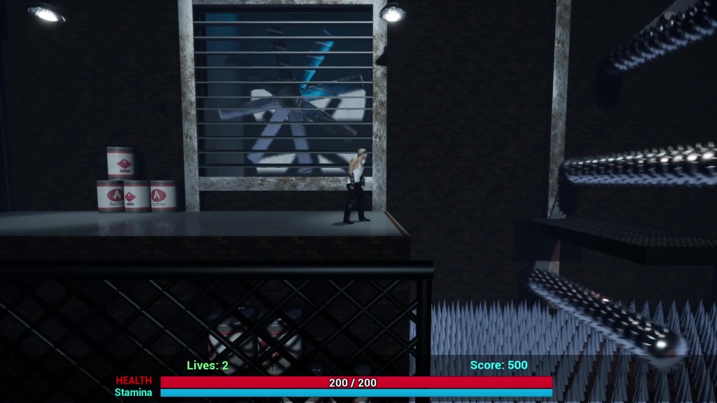 (Above) Game play screenshot of my primary level design and evironment art in “Fists of Vengeance”. All obstacles and environment elements were created by me using just blockmesh, textures, and coded using blueprints in UE4. No asset packs or imported objects.
